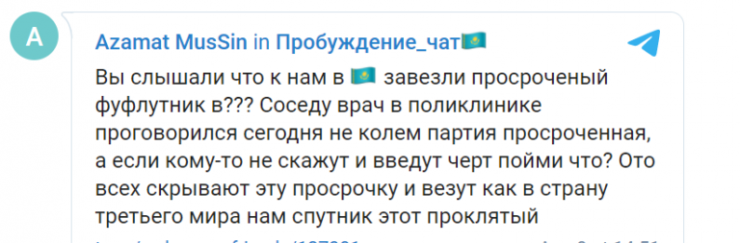 "Бізге мерзімі өткен нәрсе әкелінгенін естідіңіздер ме? Ауруханадағы дәрігер көршіме партияның мерзімі өткенін байқамай айтып қойған. Ешкімге айтпай, соны біреуге салып жіберсе ше? Мерзімі өткенін бәрінен жасырып, үшінші әлем елі ретінде бізге осы қарғыс атқыр "Спутникті" әкеле жатыр", - делінген хабарламада.