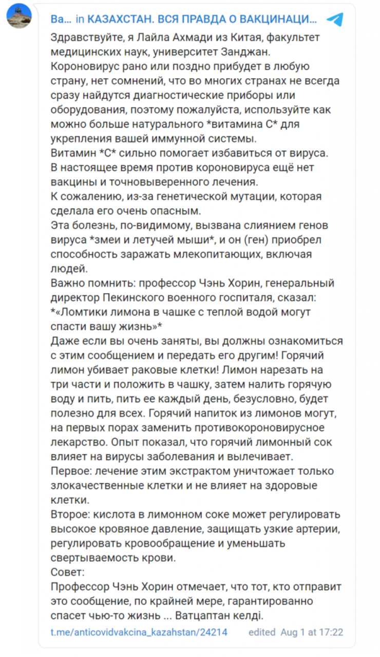 "Ыстық лимон қатерлі ісік жасушаларын өлтіреді. Лимонды үшке бөліп, ыстық суға салып, күнде ішу қажет. Бұл бәріне пайдалы. Лимон қосылған ыстық сусын коронавирусқа қарсы дәрілерді алмастырады. Тәжірибеден көргеніміздей, ыстық лимон сусыны вирусқа әсер етіп, аурудан жазады", - делінген хабарлама үзіндісінде.