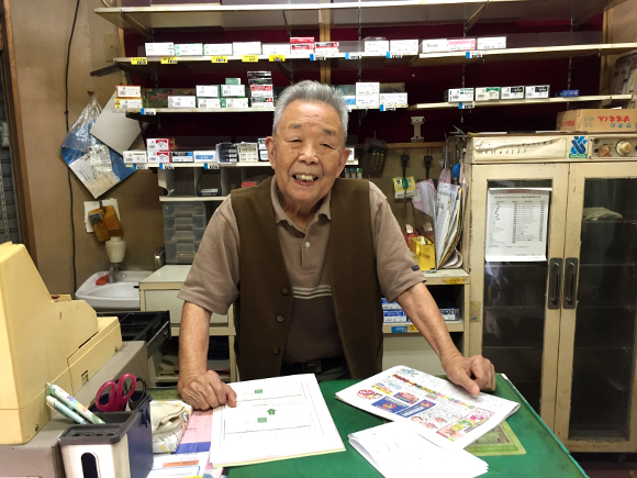 90-летний владелец магазина господин Учияма рассказал, что открыл кондитерскую около 50 лет назад. Но сейчас сил уже не осталось, поэтому он просто торгует сигаретами из окна на другой стороне магазина, а продуктами давно уже не занимается.