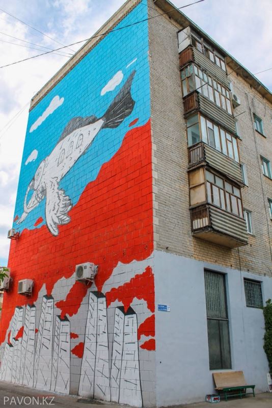 "И последняя информация - в Иртыш произведен выброс ядов со стороны КазЦинка. Экологи трубят об экологической катастрофе, чиновники - молчат, как рыбы! Вот о чем "Павлодарский птицерыб" неизвестного автора лет 14. Вот почему я решил сделать этот рисунок в масштабе, в самом центре Павлодара. Пожалуйста, давайте кричать так, чтобы они, наверху, нас УСЛЫШАЛИ!", - написал художник.