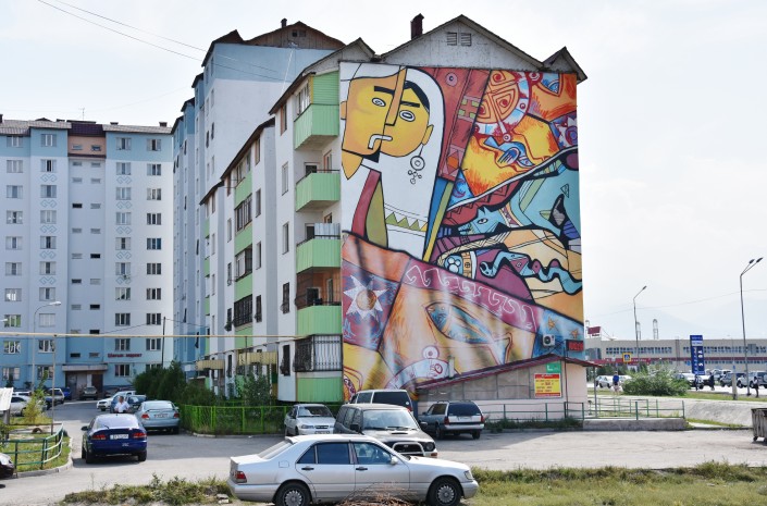 Другие участники команды Repas - Recon - Айдар Джусамбаев и Rusel - Руслан Гилязов изобразили на своем фасаде работы казахстанского художника-графика Расильбека Естемесова, у которого очень интересный и самобытный этно-стиль. Ребята пошли дальше и сделали коллаж из его работ, ведь так сложно выбрать что-либо одно из такого многообразия образов и сюжетов.
