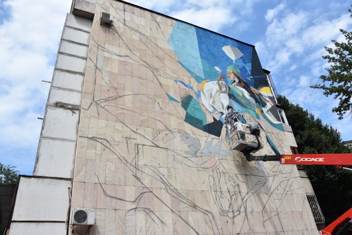 Константин Данилов, известный как Zmogk, - авторитетный московский граффити-художник, использующий в своих работах яркие, открытые цвета, динамику и некоторый хаос в композиционных решениях. Помимо того, что это первый визит художника в Казахстан, так еще и техника исполнения на этот раз также была для него нова. В отличие от привычных аэрозольных баллончиков Kostya Zmogk впервые попробовал работать с красками. "Для меня этот проект оказался очень интересным. Я никогда ранее не использовал для создания муралов такие инструменты, как валики и кисти. Хотя это было трудно и потребовалось больше времени, чем я ожидал, я получил новый опыт. Я счастлив и доволен результатом", - рассказал художник.