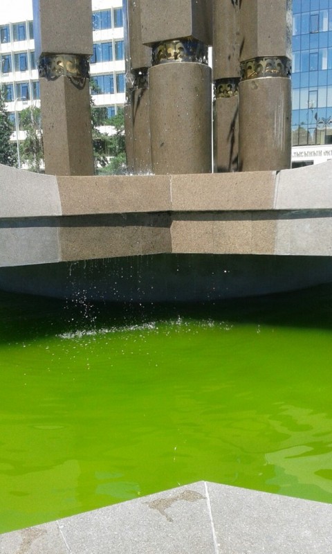 Зеленая вода в фонтане напугала жителей Талдыкоргана. Фото с цветной жидкостью они выложили в Интернет, передает корреспондент Tengrinews.kz.
