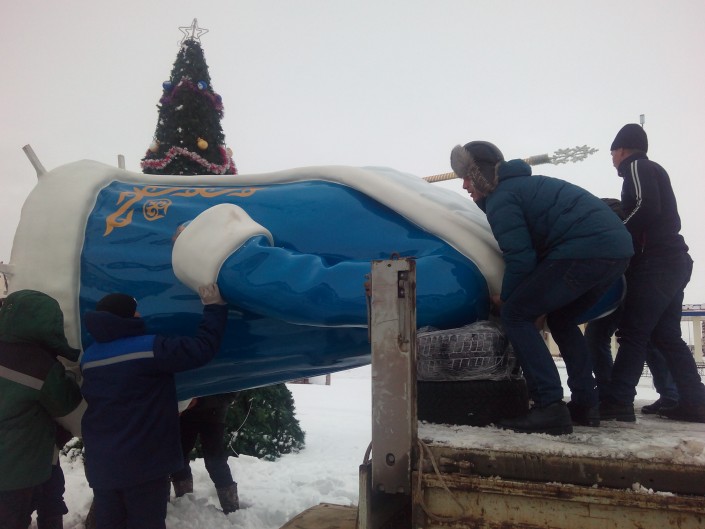 Сегодня скульптуру установили перед недавно открывшимся Домом дружбы на Юго-Востоке Караганды. Дед Мороз со светящимся посохом поставили около елки. Авторы конструкции тщательно вытерли каждый сантиметр своего "детища" и даже поверили скульптуру на прочность, встав на руки сказочного персонажа.