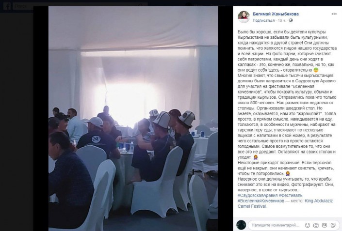 Журналистка одного из кыргызских телеканалов Бегимай Жаныбекова на своей странице в Facebook пожаловалась на некультурное поведение своих соотечественников, приехавших на международный этнофестиваль Camel Fest в Саудовскую Аравию.
