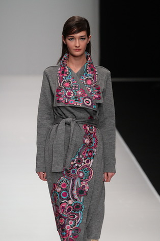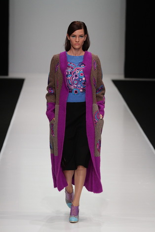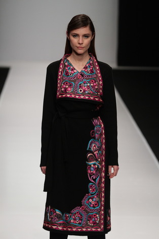 В декоративных композициях вышивок четко проступают орнаментальные мотивы, близкие творчеству Балнур Асановой. Оттенки шелка в арабесках вышивок создают неожиданный и яркий контраст с довольно грубыми фактурами вязки.