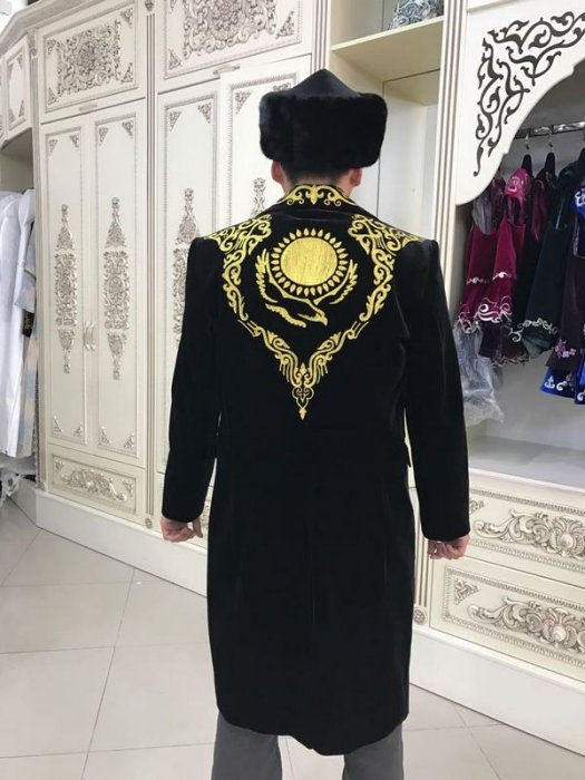 "Чапан сшит сотрудниками дома моды "Нур-Шах". Он изготовлен из велюра, так как на нем узор вышивается красиво. Мы работали с представителем заказчика, главным требованием было сшить чапан как удлиненный классический сюртук, с английским воротником, карманами, со строгим казахским узором и изображением в центре солнца с лучами, под которым - парящий орел. Это был индивидуальный и неповторимый заказ", - поделилась Нурджамал Нурпейсова.