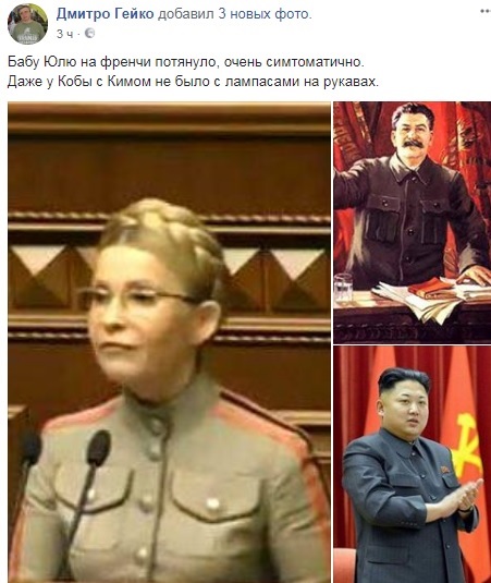 Комментаторы уже сравнивают костюм бывшего премьер-министра страны с френчами Иосифа Сталина и Ким Чен Ына: "Ну, как фюрер", "Готовится воевать за президентское кресло, униформу подготовила", "Боевая баба", "Плавно переходит на "адидасы", там тоже лампасы есть на штанах".
