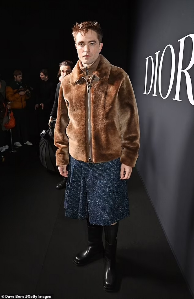 "36-летний актер выглядел стильно, надев темно-синюю твидовую юбку, которую он сочетал с коричневой меховой курткой-бомбером. Роберт, который снялся в последней рекламной кампании Dior, излучал уверенность перед тем, как занять свое место в усеянном звездами первом ряду", - сообщили журналисты.