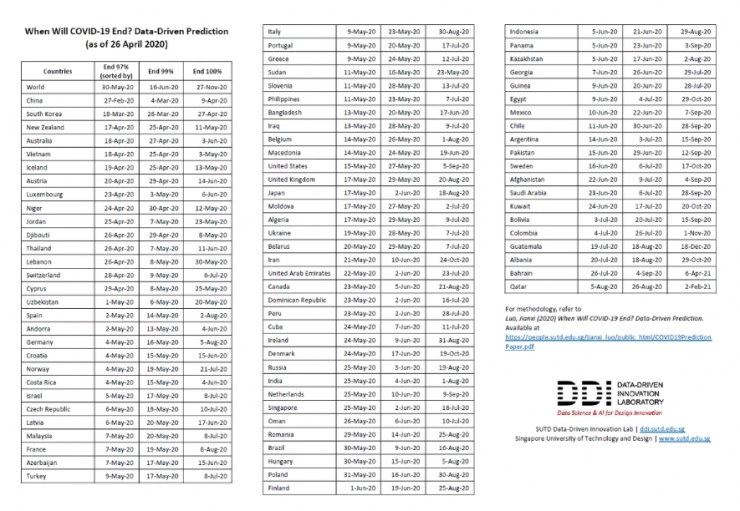 Согласно выводам ученых, в США эпидемия полностью утихнет к 9 сентября, в России - к 7 августа, в Иране - к 28 сентября, в Турции - к 30 июля, в Италии - к 31 августа, в Испании - ко 2 августа, в Канаде - к 20 августа, в Великобритании - к 22 августа, во Франции - к 9 августа. В Китае завершение ситуации с COVID-19 произошло уже 9 апреля.