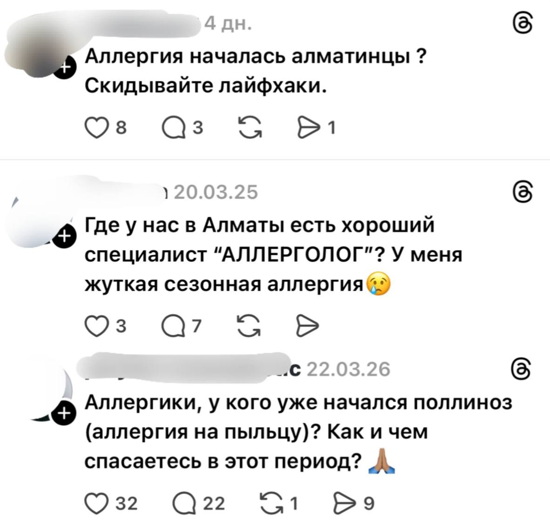 Табынов и Нурпеисов объясняют ухудшение самочувствия сразу несколькими факторами: совпали пик "пыления" вяза, локальные выбросы пыльцы хвойных и начало сезона злаков.