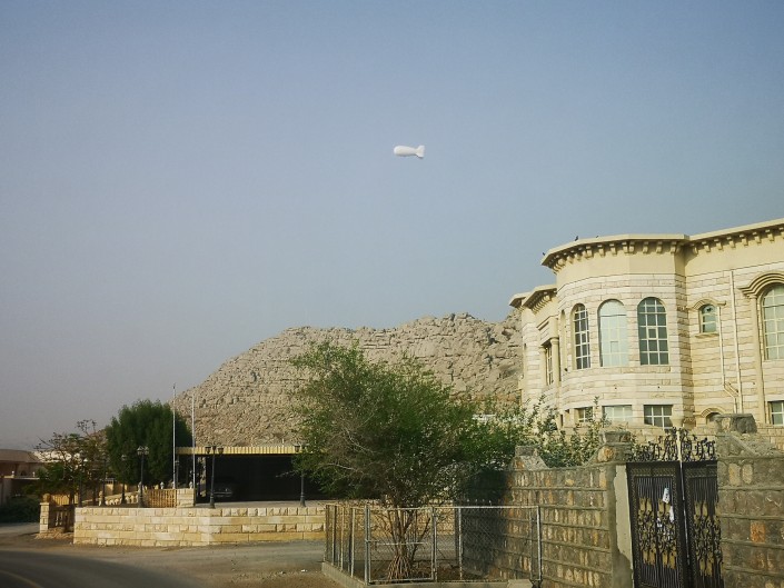 Местный антураж дополнял гелиевый беспилотник, находящийся на вооружении оманской армии. Он висит прямо надо роскошными особняками: граница с Оманом всего в 10 километрах, военные бдят.