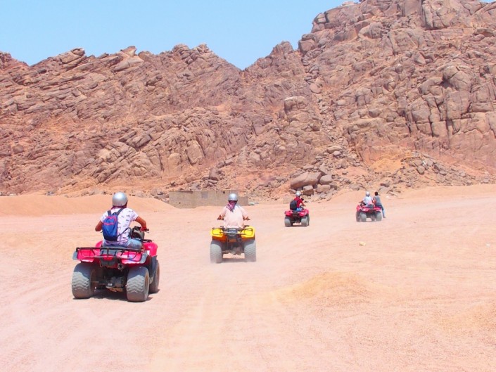 В центре квадроциклов нам выдали красно-бело-черные арафатки. Так как такая же расцветка соответствует цветам национального флага Египта, мы решили, что стали египетскими бедуинами. Коротенький инструктаж (да и что рассказывать?! – квадроцикл прост как дважды два четыре: рычажок газа на правом руле и две ручки тормоза на передние и задние колеса) – и в путь! Единственная просьба гида-инструктора – ехать колонной, друг за другом.