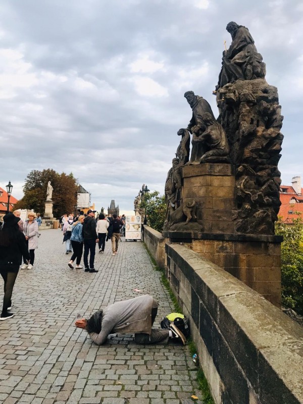 Что меня удивило в Праге, так это уличные попрошайки. Довольно молодые мужчины сидят на улицах на четвереньках в интересной позе "смирения". Говорят, что в старые времена попрошайничество было своего рода профессией. Милостыню просили в основном шахтеры, оставшиеся без работы. Как мне объяснили местные, современные попрошайки для пущего эффекта используют собак, а деньги спускают на алкоголь и наркотики. В первые дни мы им подавали, а потом здравомыслие взяло вверх.