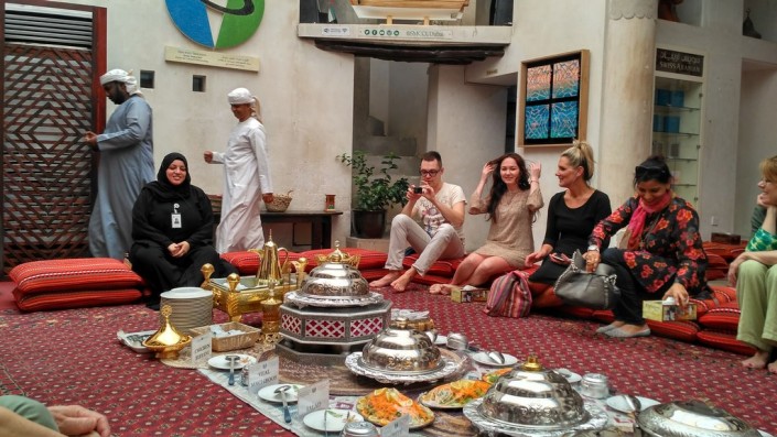 Все, что сейчас строится в Дубае, имеет несколько космополитичный характер, но есть у города и собственная архитектурная история. В этом мы убедились, посетив аутентичный исторический центр Аль-Фахиди, из которого и вырос современный Дубай. Прогулки по улочкам старого города, арабский кофе с кардамоном во дворике под раскидистым деревом, удивительная резьба старинных дверей, пение птиц. Здесь же вы сможете заглянуть в культурный фонд Alserkal, созданный для поддержки начинающих художников и дизайнеров, в чьих работах перекликаются старина и современность. Но ваши впечатления не будут полными без обеда в традиционном эмиратском стиле. Сам обед сопровождается беседой с гидом - в нашем случае это была очаровательная девушка, которая отвечала на все вопросы, связанные с арабскими традициями. Из ее рассказа мы узнали, например, что женская арабская одежда может быть не только черного цвета, а вторая жена у арабского мужчины может появиться с согласия первой.