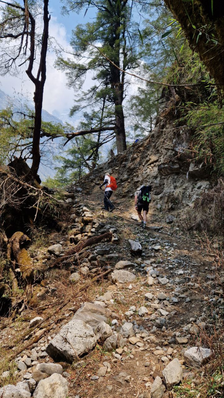 На полпути к следующему месту ночевки, так называемому итальянскому базовому лагерю на высоте 3500 метров, они попали в другую климатическую зону. Деревья здесь выше и тянутся к вершинам гор. Растительность покрывала скалы и склоны вдоль русла горной реки.
