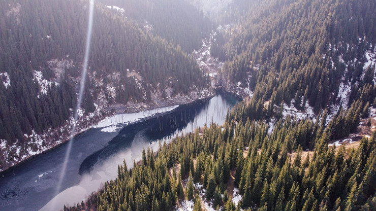 Ученые говорят, что Каинды возникло около 100 лет назад практически случайно - произошел большой обвал горной породы, который перегородил ущелье естественной дамбой. Так получился этот невероятный водоем длиной около 400 метров и глубиной почти 30 метров. Летом, к слову, в озеро можно окунуться - из-за того, что в него втекает горная речка, даже в жарком июле вода в нем ледяная, и такое купание незабываемо. Освежает! Со всех сторон озеро Каинды окружено осыпными каменистыми склонами и крутыми взлетами скал. Выше него - скальный тупик, и только с одной стороны можно подъехать к воде на машине. Со скалистого гребня открываются потрясающие виды на ущелье Саты, долину реки Чилик и само ущелье Каинды.