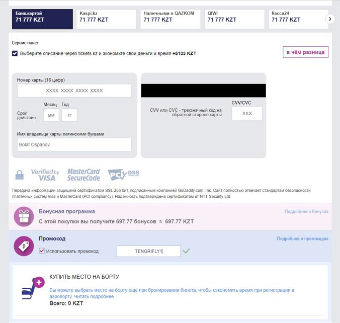 TengriTravel и билетное агентство Tickets.kz дарят всем читателям 100 промокодов на сумму 2 000 тенге каждый. Просто введите кодовое слово TENGRIFLY1 в специальное поле "промокод" при бронировании билета и получите скидку.