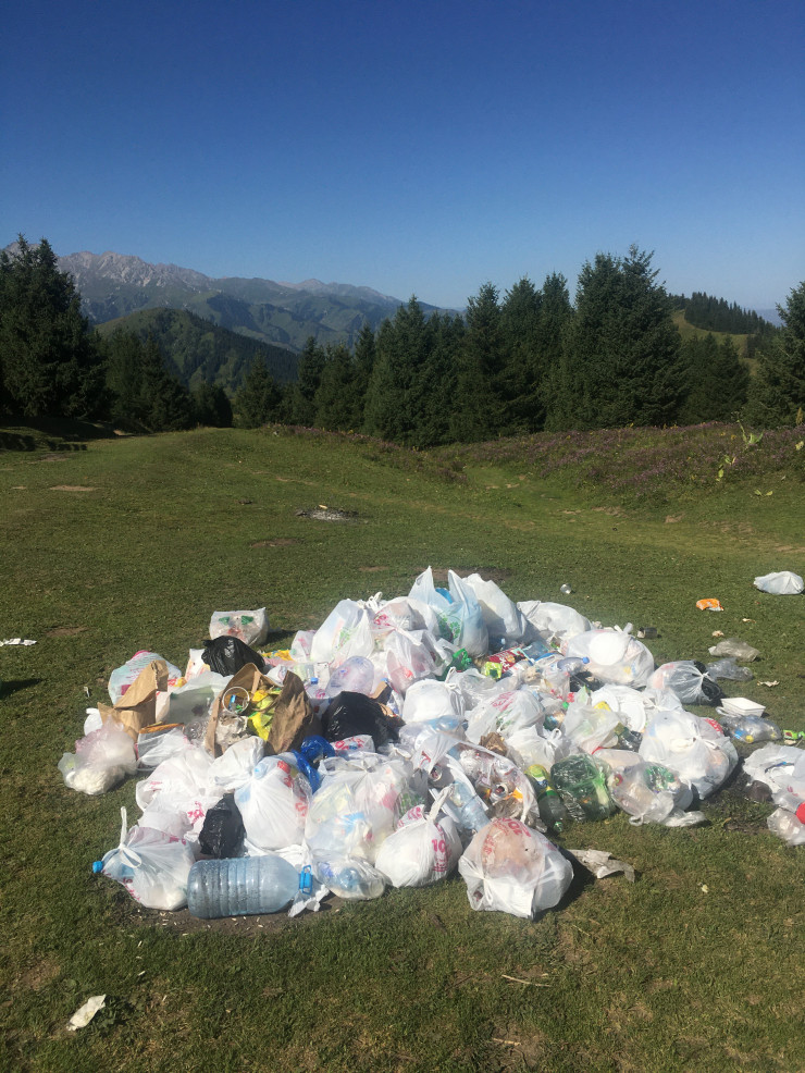 Отметим, что многие пытались забрать с собой по 1-2 пакету чужого мусора, чтобы очистить поляну, но все равно до сих пор на Кок-Жайлау остается большая куча пакетов.