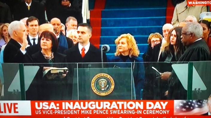22.53. "Я, Майкл Ричард Пенс, клянусь, что буду исполнять обязанности и защищать нашу страну от всех врагов, внутренних и внешних. Беру на себя все обязательства, которые я принимаю со всем осознанием и без желания уклониться от них. Я буду выполнять мои обязанности и свою миссию. Да поможет мне Бог".