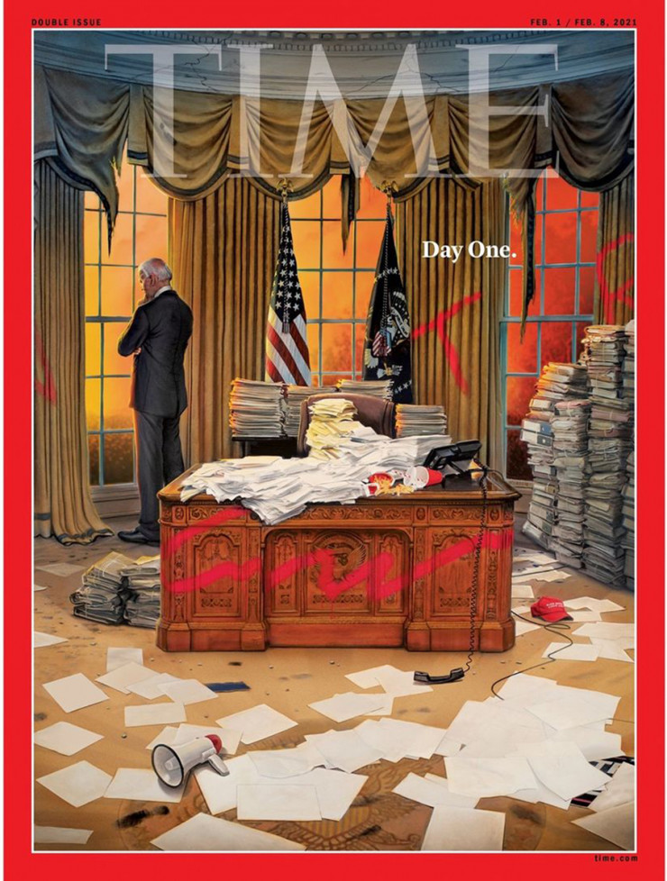 Журнал Time поместил на обложку разгромленный Овальный кабинет в Белом доме, указав на ворох проблем, которые достались Джо Байдену, вступившему в должность президента США, от Дональда Трампа. Иллюстрация опубликована в соцсетях издания, передает Tengrinews.kz.