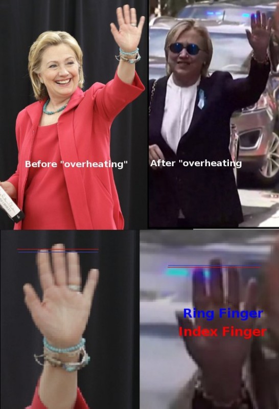 В качестве доказательства в социальных сетях активно распространяются фотографии, на которых наглядно "показаны" физические различия настоящей Хиллари и ее двойника. Так, конспирологи обращают внимание на ее нос: якобы у двойника его кончик опущен, а у Хиллари он вздернутый. Мочки ушей у них тоже разные, указательный палец у "фальшивки" короче и ноги у последней слишком худые.