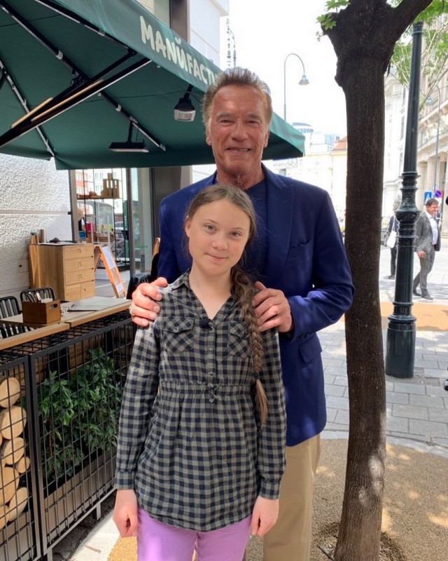 2019 жылы мамырда Грета Голливуд жұлдызы Арнольд Шварценеггермен, БҰҰ Бас хатшысымен және Австрия Президентімен кездескен. Бұл кездесу Шварцнеггердің Париж келісімін орындауды жеделдету мақсатында ұйымдастырылған конференциясында өткен. Сол кездесуінде ол былай деп мәлімдеме жасаған: "Егер біз 2030 жылға дейін ештеңе жасамайтын болсақ, онда біз қайтымсыз және бақыланбайтын тізбекті реакцияны іске қосамыз".