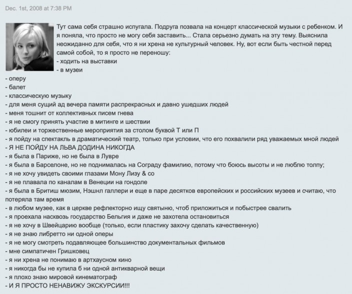 "Тут сама себя страшно испугала. Подруга позвала на концерт классической музыки с ребенком. И я поняла, что просто не могу себя заставить... Стала серьезно думать на эту тему. Выяснила неожиданно для себя, что я ни хрена не культурный человек", - откровенничала Любимова в посте, опубликованном в декабре 2008 года.