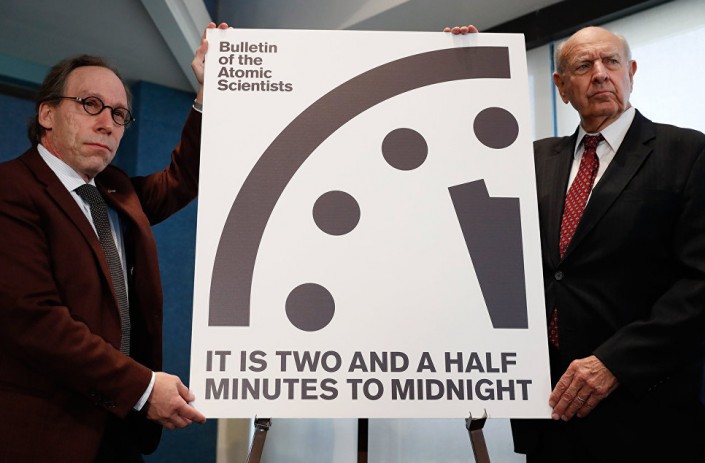 "Часы показывают две минуты до ядерной полуночи", - объявила президент этой авторитетной организации Рейчел Бронсон. Так близко к полуночи, которая символизирует момент ядерного катаклизма, они не подходили со времен первого испытания водородной бомбы в 1953 году.