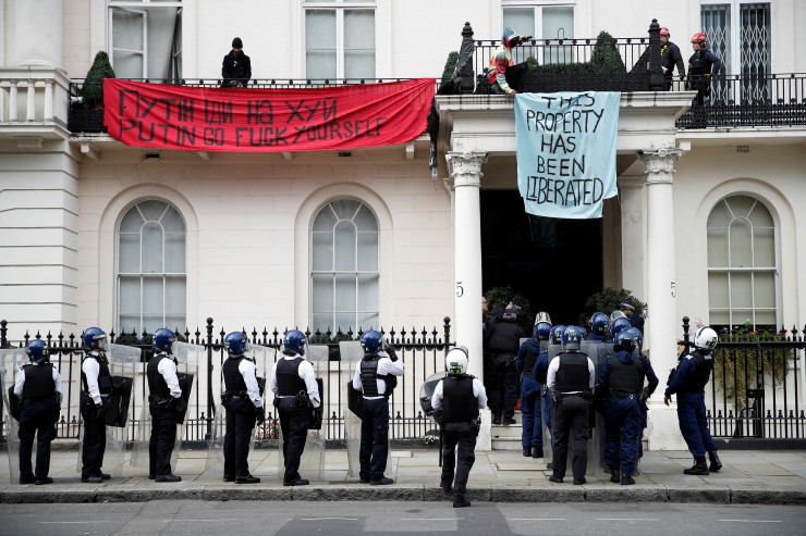 Протестующие заняли балкон особняка в центре Лондона около полуночи и оставались там большую часть дня, несмотря на усилия полиции вывести их, заявив, что возвращают собственность для украинских беженцев. Внутри особняка никто не присутствовал.