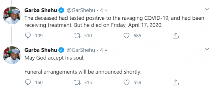 "Администрация президента с сожалением сообщает об уходе главы администрации президента Маллама Абба Киари. Усопший сдал положительный тест на опустошительный COVID-19 и проходил лечение. Но он умер в пятницу, 17 апреля", - написал на своей странице в Twitter пресс-секретарь президента.