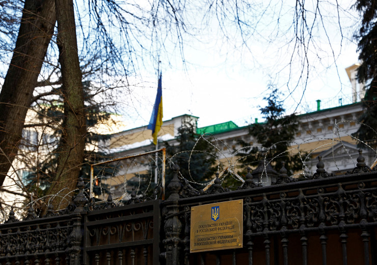 С флагштока посольства Украины в Москве сняли государственный флаг страны. Также после разрыва дипломатических отношений с Россией была демонтирована указательная табличка посольства, а его входные двери опечатали. В настоящее время территория дипмиссии огорожена, рядом с ней дежурят полицейские.