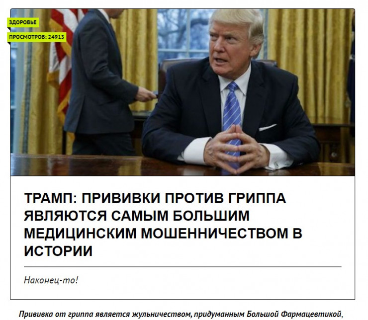В публикации об "обвинениях" Трампа в адрес фармкомпаний упоминается интервью для Opie Radio. Там Трампа действительно спрашивают о вакцинации против гриппа, на что тот отвечает, что никогда против него не вакцинировался и не болел им, после чего называет кампанию по вакцинации против гриппа 2014-2015 годов "практически полностью неэффективной". Тем не менее ни о каком мошенничестве и жульничестве со стороны производителей препаратов он не говорил, отмечает издание.