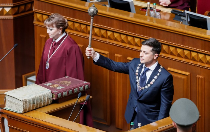 13.19 Зеленский, положив руку на конституцию Украины и Пересопницкое Евангелие (рукописный памятник искусства XVI века), приносит присягу.