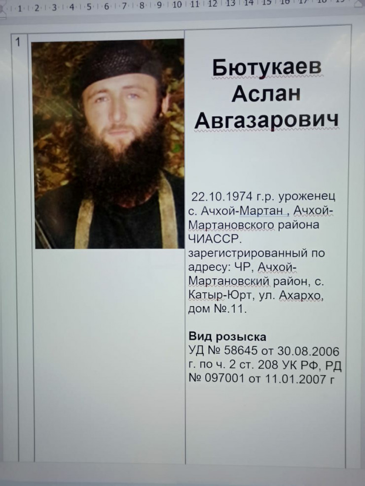 "Я лично принимал участие в разработке плана, который грамотно осуществил, на месте руководя спецоперацией, командир полка Замид Чалаев. Бандгруппе удавалось дважды уходить от преследования и боестолкновения. В третий раз им не удалось скрыться. Все шестеро боевиков банды Бютукаева уничтожены на месте, никому не удалось уйти. Уже опознаны: Бютукаев Аслан, Саралиев, Базуркаев Иса, Даршаев.