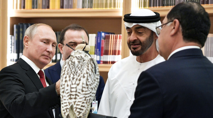 Владимир Путин дарит белого кречета наследному принцу Абу-Даби Мухаммеду бен Заиду Аль Нахайяну. © РИА Новости