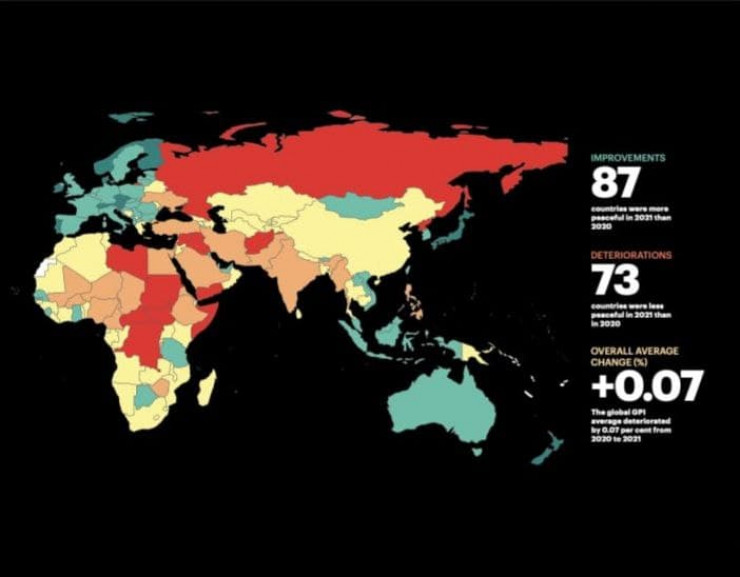 Повышение индекса миролюбия зафиксировано в 87 странах, ухудшение - в 73. В целом общемировой показатель миролюбия ухудшился на 0,07 процента.