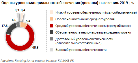 По уровню материального достатка 68,8 процента респондентов отнесли себя к среднему уровню обеспеченности. 0,4 процента респондентов указали низкий уровень обеспеченности, и лишь 0,3 процента респондентов отнесли себя к высокому уровню обеспеченности.