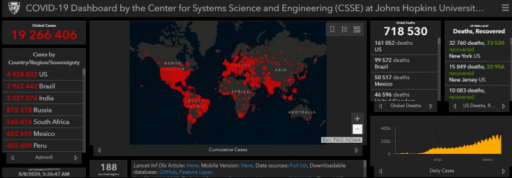 Число заразившихся коронавирусом в мире к утру 8 августа превысило 19,2 миллиона человек. Об этом свидетельствуют данные проекта Университета Джонса Хопкинса, передает корреспондент Tengrinews.kz.