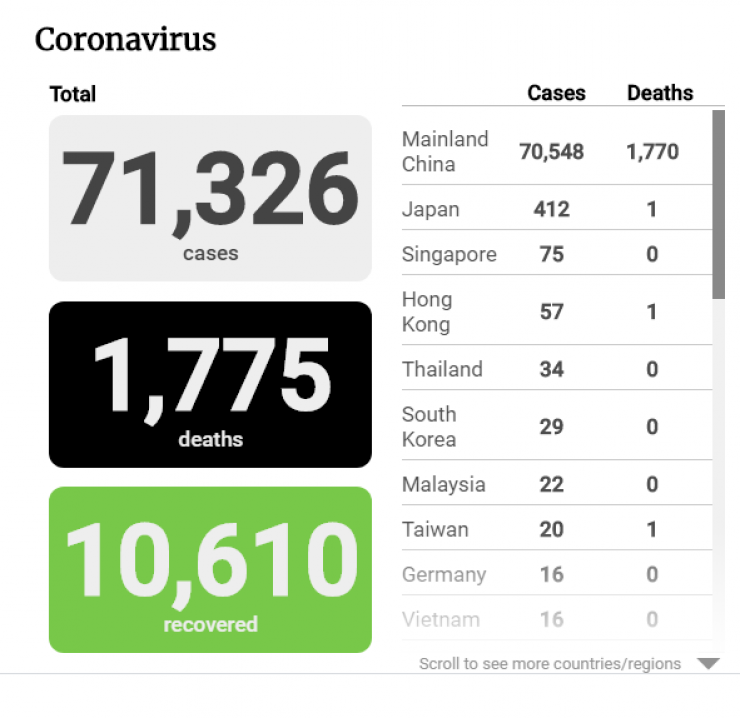 South China Morning Post хабарына қарағанда, 17 ақпандағы таңғы жағдай бойынша, бүкіл әлемде 71 326 адам коронавирустың жаңа түрін жұқтырған, қайтыс болғандардың саны - 1775 адам. Тағы 10 610 науқас ауруханадан шығарылған.