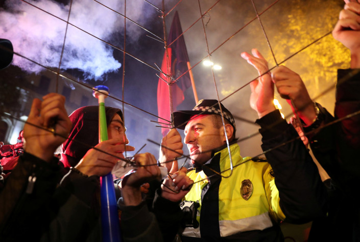 Спецназ появился на прилегающей к парламенту территории, после того как митингующие заблокировали все входы в законодательный орган, отмечает грузинский Первый канал.