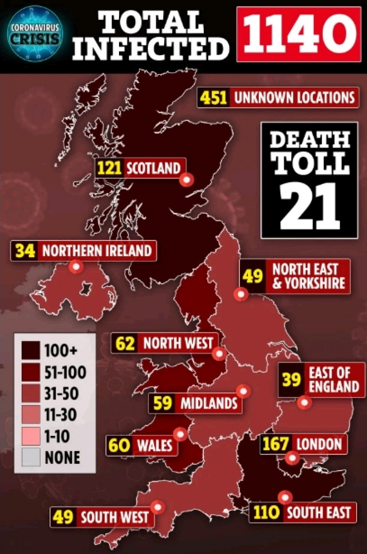 Тем временем число заразившихся коронавирусом в Великобритании достигло 1140 человек, количество скончавшихся за сутки увеличилось до 21. Об этом 14 марта сообщил британский минздрав.
