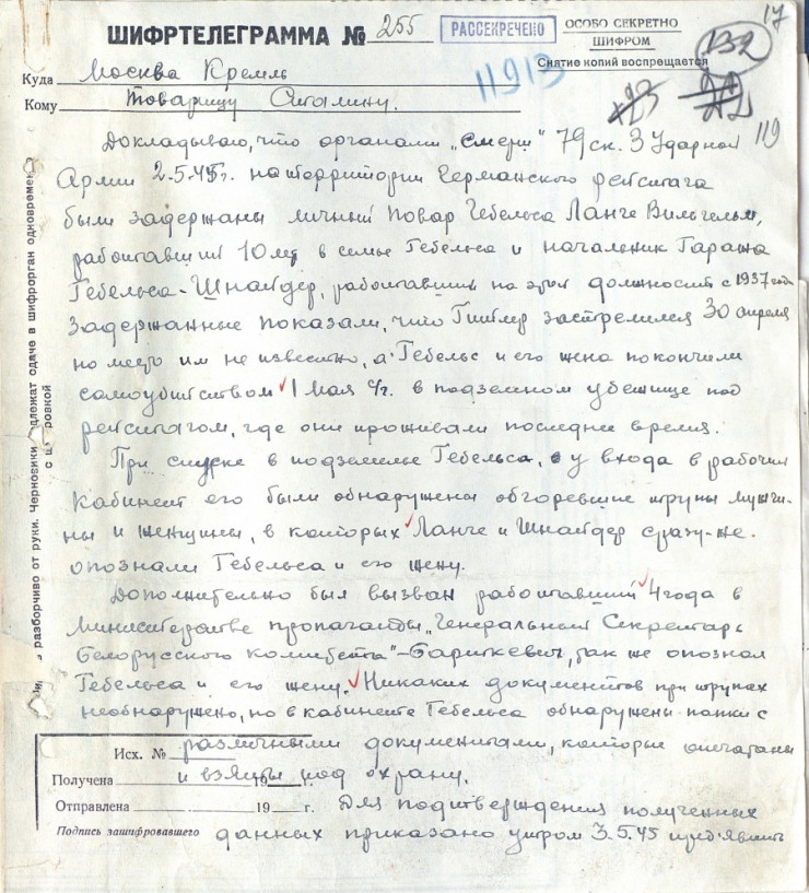 В документе говорится, что контрразведчики задержали на территории Рейхстага личного повара Геббельса Вильгельма Ланге и начальника гаража рейхсминистра Шнайдера. Те заявили, что Гитлер совершил самоубийство 30 апреля, но место захоронения тела им не было известно, а Геббельс и его жена покончили жизнь самоубийством 1 мая в подземном убежище под Рейхстагом.