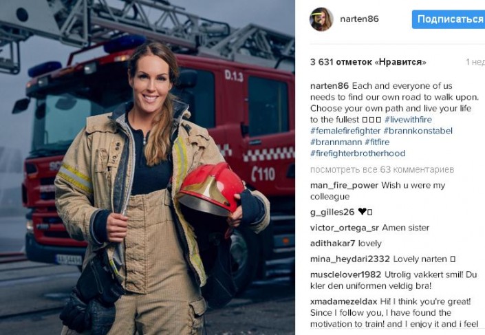 Самой привлекательной пожарной в мире называют норвежку Гунн Нартен (Gunn Narten) ее поклонники в Instagram, пишет The Daily Mail.