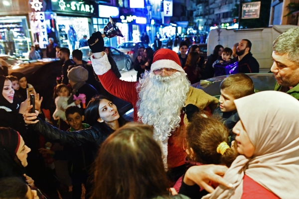 Рождество также празднуют в Сирии. На фотографии ниже жители города Латакия позируют с мужчиной в костюме Санта-Клауса.