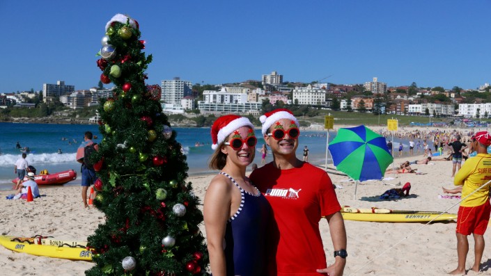В Сиднее главный символ праздника нередко устанавливают на пляжах, а местные спасатели надевают красные шапки или "оленьи рога".