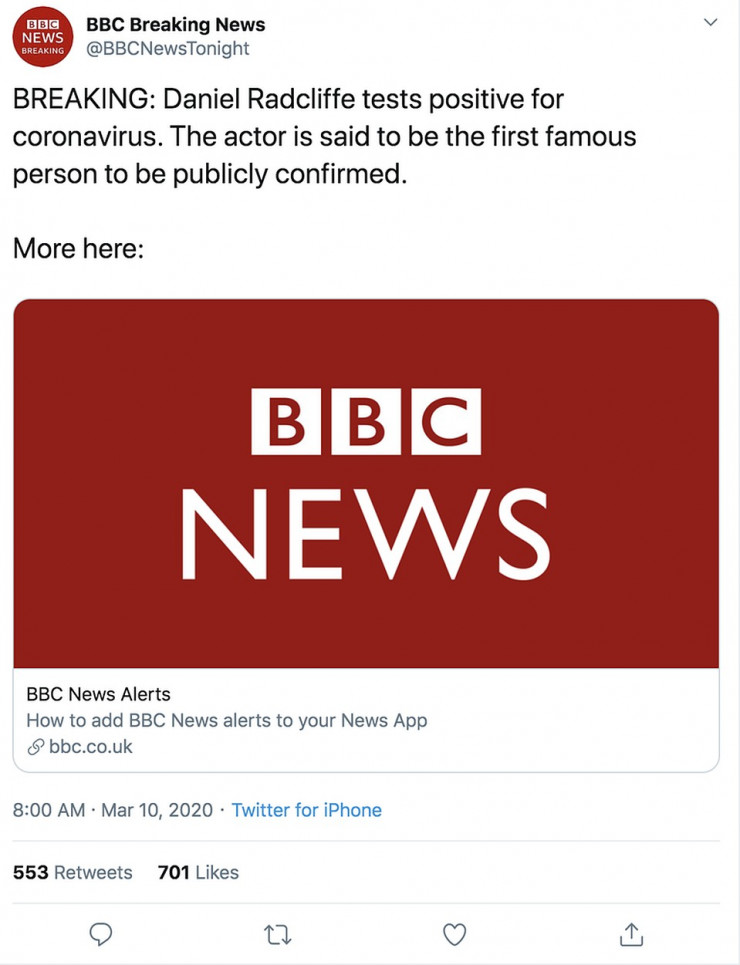 "Тест Дэниела Рэдклиффа на коронавирус дал положительный результат. Актер стал первым известным человеком, который подтвердил заражение. Больше информации можно найти на сайте", - такой пост появился в Twitter-аккаунте BBC Breaking News.