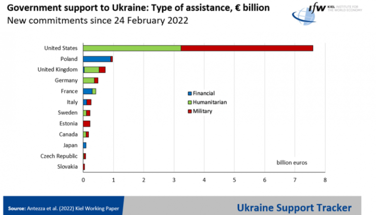 Согласно данным Ukraine Support Tracker, новой базы данных государственной поддержки Украины, составленной исследователями Кильского института мировой экономики, в период с 24 февраля по 27 марта США предоставили Украине сумму, эквивалентную 7,6 миллиарда евро, что сделало Вашингтон крупнейшим союзником Киева.
