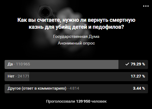 Госдума на официальной странице "ВКонтакте" запустила анонимный опрос, поддерживают ли россияне возвращение смертной казни для убийц детей и педофилов. На момент написания новости в голосовании приняли участие 140 тысяч человек. "За" возвращение смертной казни выступили 79 процентов опрошенных. "Против" - 17 процентов.