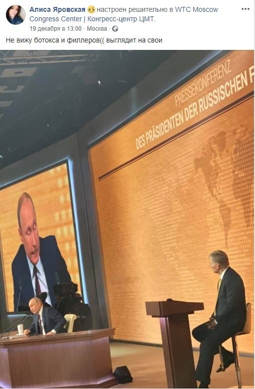 Есть еще одна версия увольнения Алисы Яровской. В своем Facebook во время прямой линии с Путиным она делилась со своими подписчиками наблюдениями о внешнем виде президента. "Не вижу ботокса и филлеров, выглядит на свои", - написала она под фото, которое сделала из зала во время встречи президента с прессой.
